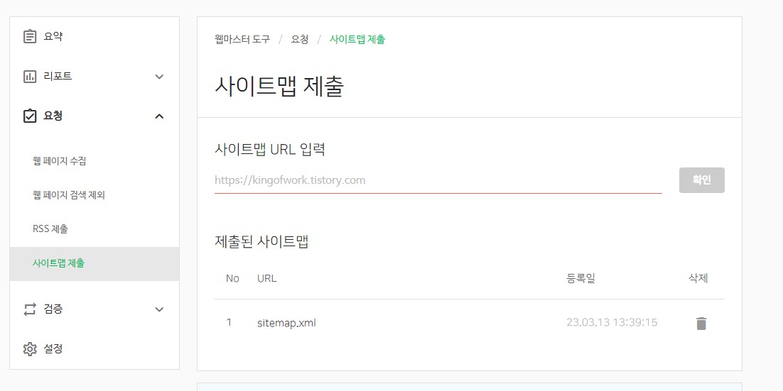 다음은 구글서치콘솔과 마찬가지로 사이트맵 제출이 필요한데요. 요청 > 사이트맵 제출로 들어가 티스토리 블로그 사이트맵을 제출하시면 됩니다.
