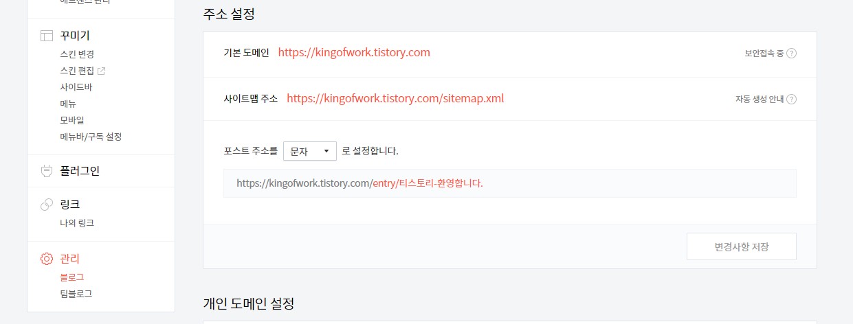 티스토리 사이트맵 주소는 티스토리 설정 > 관리 > 블로그를 통해 들어가면 주소 설정 항목에 표시되어 있으니 해당 주소를 복사하셔서 네이버 서치어드바이저에 붙여넣기하면 완료!