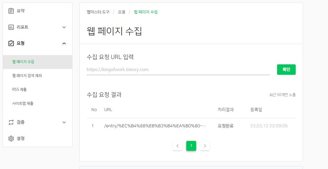 이 단계를 모두 마치면 수집 요청 결과에 1~2틀 정도 지나면 처리결과가 표시됩니다. 요청한다고 해서 바로 검색엔진 노출을 보장하는 것은 아니지만 그래도 확률이 올라가니까 필수적으로 신청해 주세요.