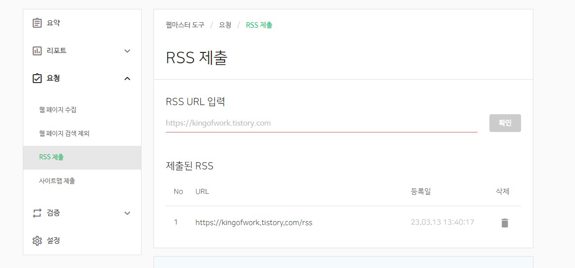 RSS 제출도 간단합니다. 티스토리 주소 뒤에 rss를 붙여서 입력해 주면 간단하게 완료!