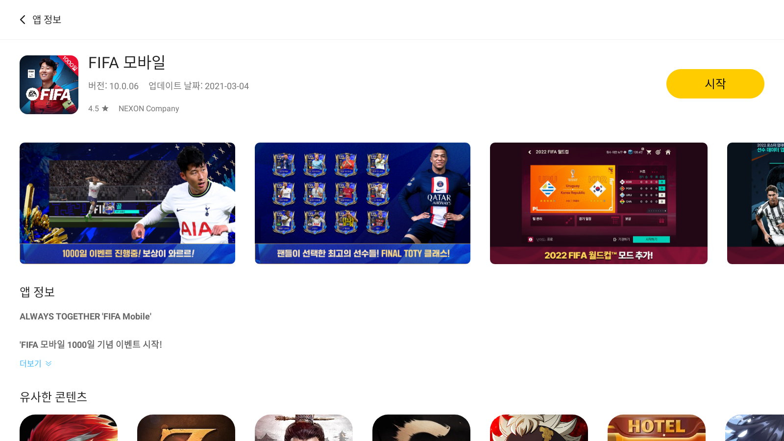 FIFA 모바일을 스토어에서 검색하면 앱 정보 화면을 볼 수 있는데요. 여기서 시작을 누르면 FIFA 모바일을 LD플레이어에 설치를 할 수 있습니다. 녹스 플레이어나 블루스택도 앱 다운로드 방식은 동일하기 때문에 간단하게 앱을 다운로드 받을 수 있습니다. 다운로드가 완료되면 앱을 실행해 볼까요?