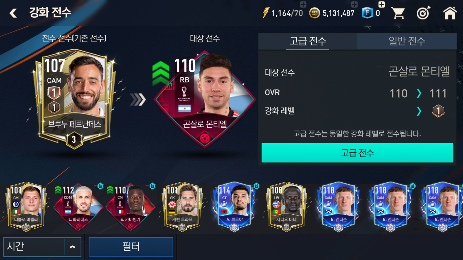 브루누 페르난데스에서 곤살로 몬티엘로 일반 전수를 해보도록 하겠습니다. 브루누 페르난데스는 현재 강화 레벨이 '1'인 상태로 일반 전수라도 '1'이 그대로 전수가 되게 됩니다. (만약 2레벨 이었다면 일반 전수 시 1로 전수가 되겠죠)