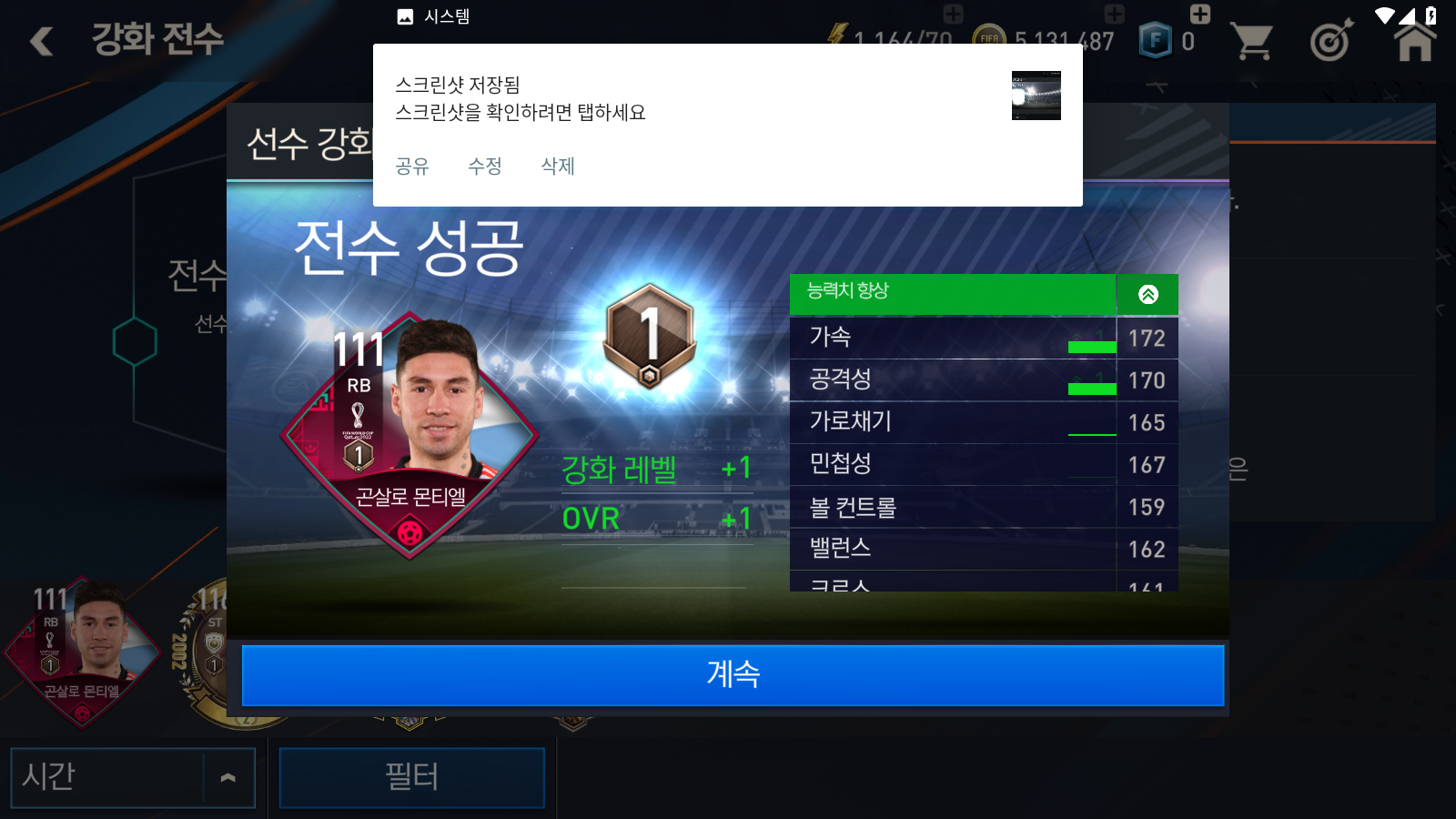 스크린샷 저장됨이 같이 찍혀버렸네요ㅎㅎ 전수 성공 시에는 전수 성공 메시지와 함께 강화 레벨과 OVR이 상승하게 됩니다. 전수는 실패라는 항목은 없기 때문에 터진다거나 하는 걱정은 하지 않으셔도 괜찮습니다.