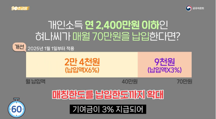2025년부터는 모든 가입자가 납입한 만큼 기여금을 받을 수 있도록 모든 소득 구간에서 납입한도까지 기여금을 매칭하는 것으로 변경되었습니다.